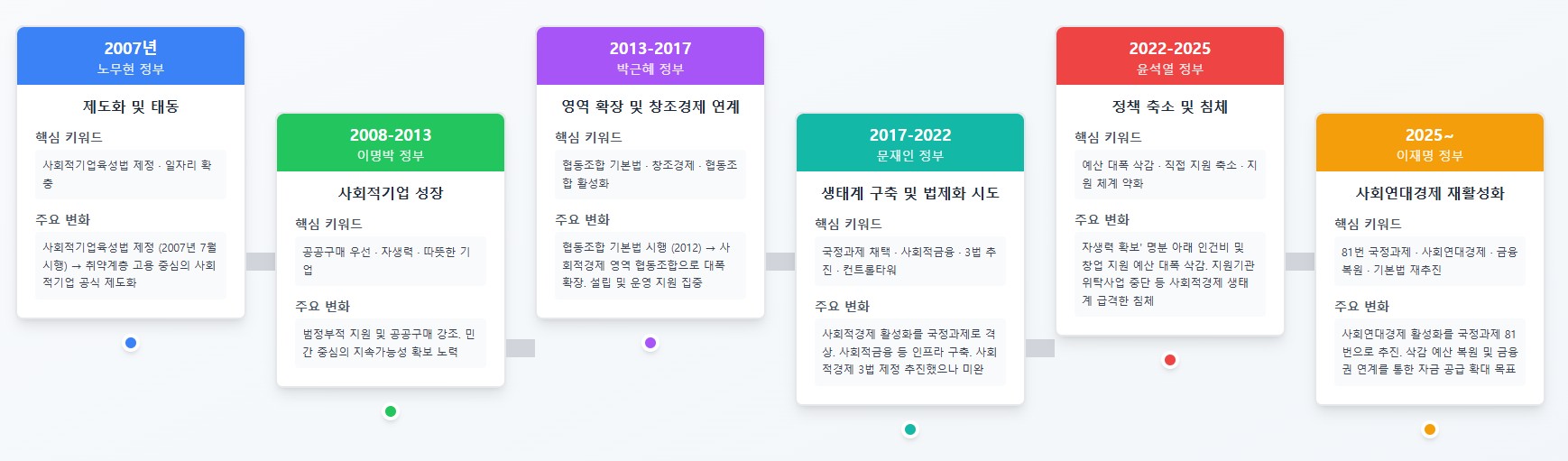 20여년간 사회적경제를 둘러싼 변화도 컸습니다. 특히 정책 변화가 영향을 많이 주었죠. 사회적기업육성법이 시행된 2007년부터 사회연대경제 활성화가 123개 국정과제 중 하나(81번)로 추진된 2025년까지. 시기별 정책 흐름을 살펴보면 아래와 같습니다.